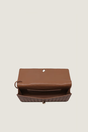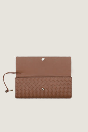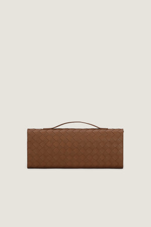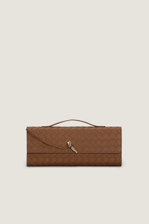 Crafted from premium Tea Pink Intrecciato leather, the Andiamo Clutch effortlessly combines fashion and utility. Featuring an elegant top handle and sleek metallic knot fastening, this compact design includes an additional pocket for essential items. Versatile for any occasion, this clutch exudes sophistication and practicality in equal measure.