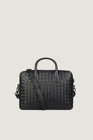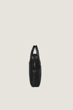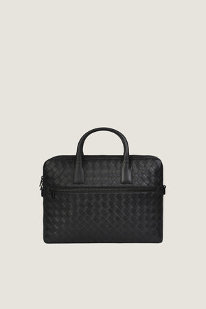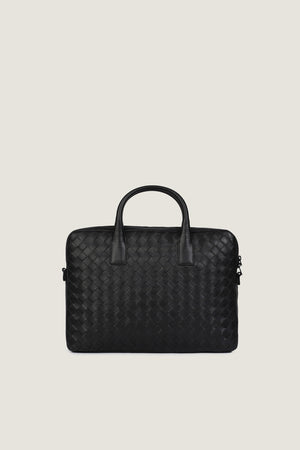 Elevate your professional look with our Hand Woven Laptop Bag. Crafted from high-quality sheep leather in a sleek black finish, this bag exudes both sophistication and durability. Featuring a secure black oxide zipper and a refined D-style buckle, it also offers a dedicated laptop compartment and zippered pocket for additional storage. The intricate scrolli bit detailing adds a touch of artistry to this functional and stylish bag.