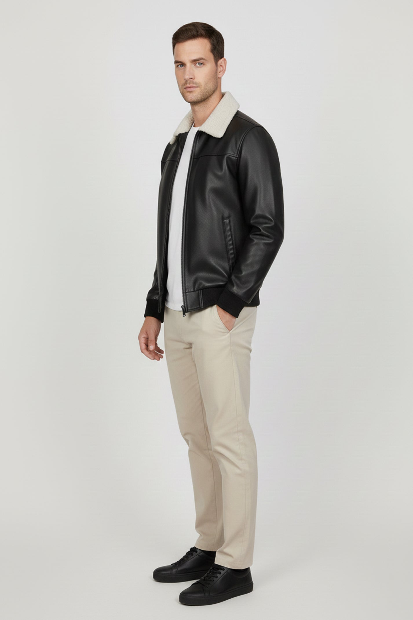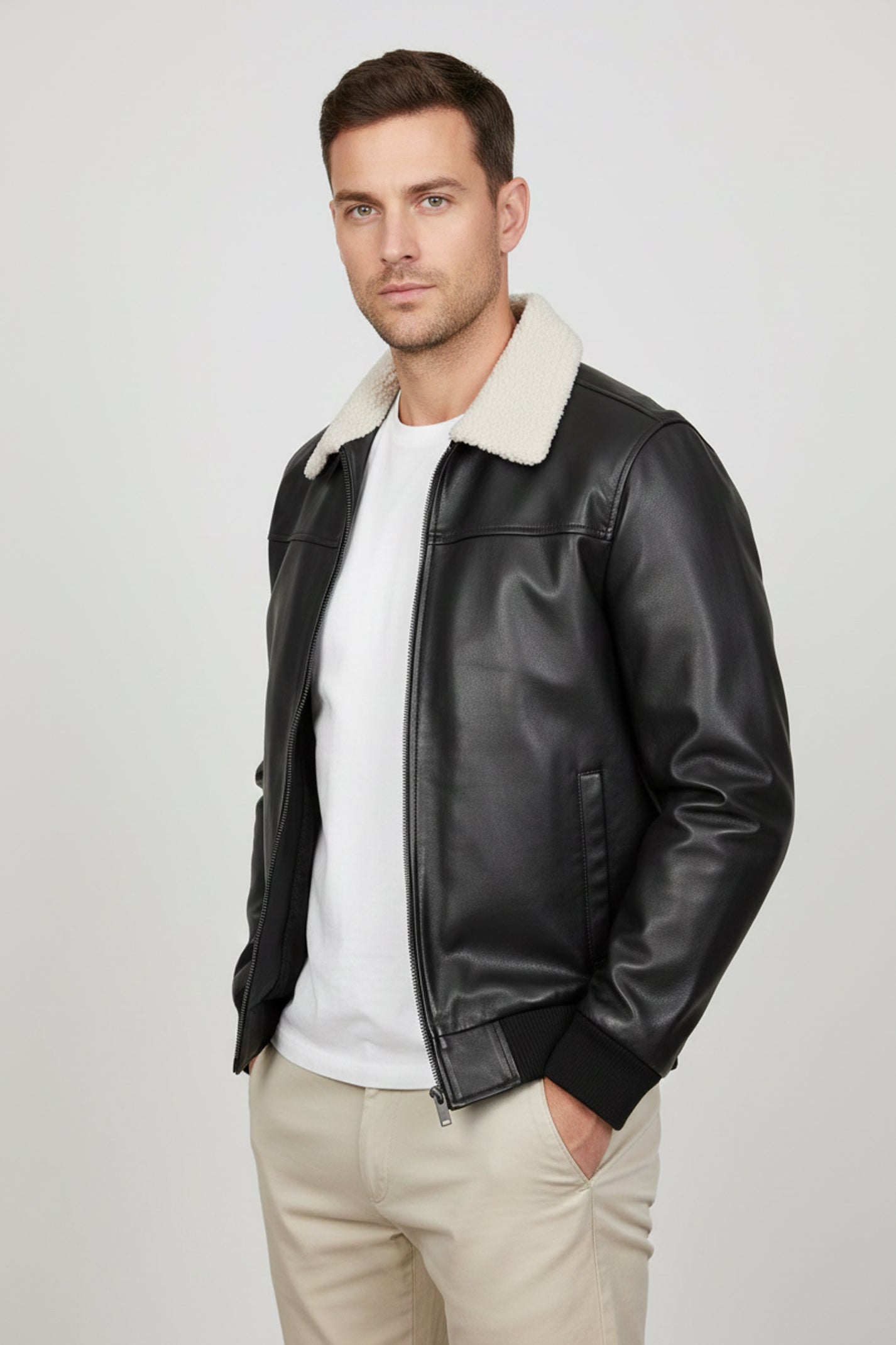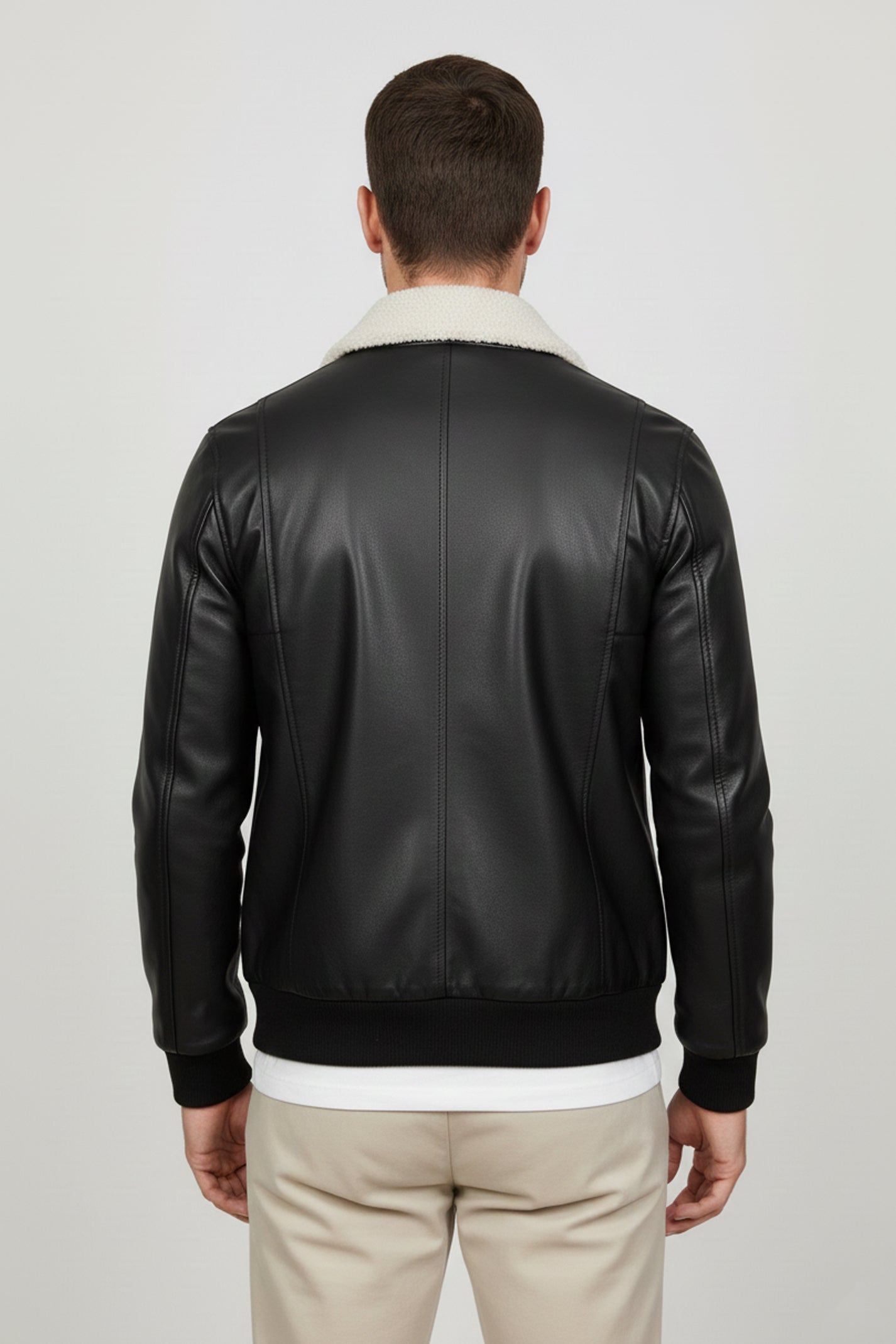 This men's black bomber jacket is crafted from 100% premium quality genuine cow soft and supple leather, while the lining is composed of 100% polyester. Featuring a front open design with genuine YKK zippers for a secure closure, it also boasts two side pockets, rib-knit cuffs, and a fur collar for a touch of textural warmth.