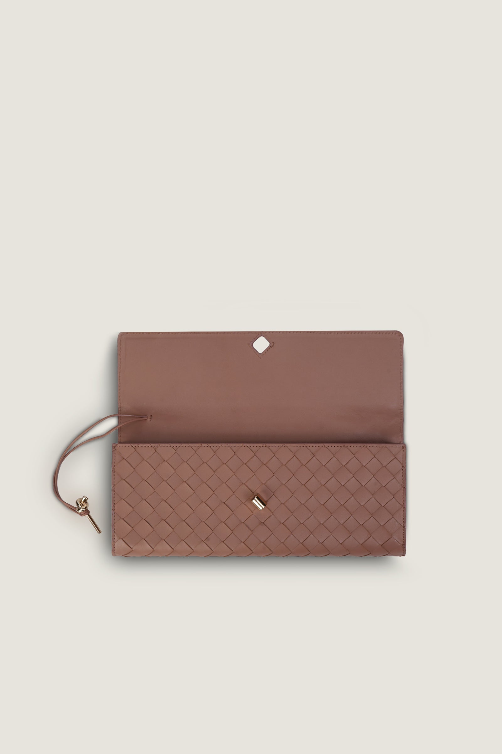 Elevate your accessory collection with the Andiamo Clutch in elegant tea pink. Crafted from luxurious Intrecciato leather, this chic and compact clutch boasts a refined top handle design and a metallic knot closure. Alongside a small essential pocket, it combines style and practicality in a sophisticated bundle.