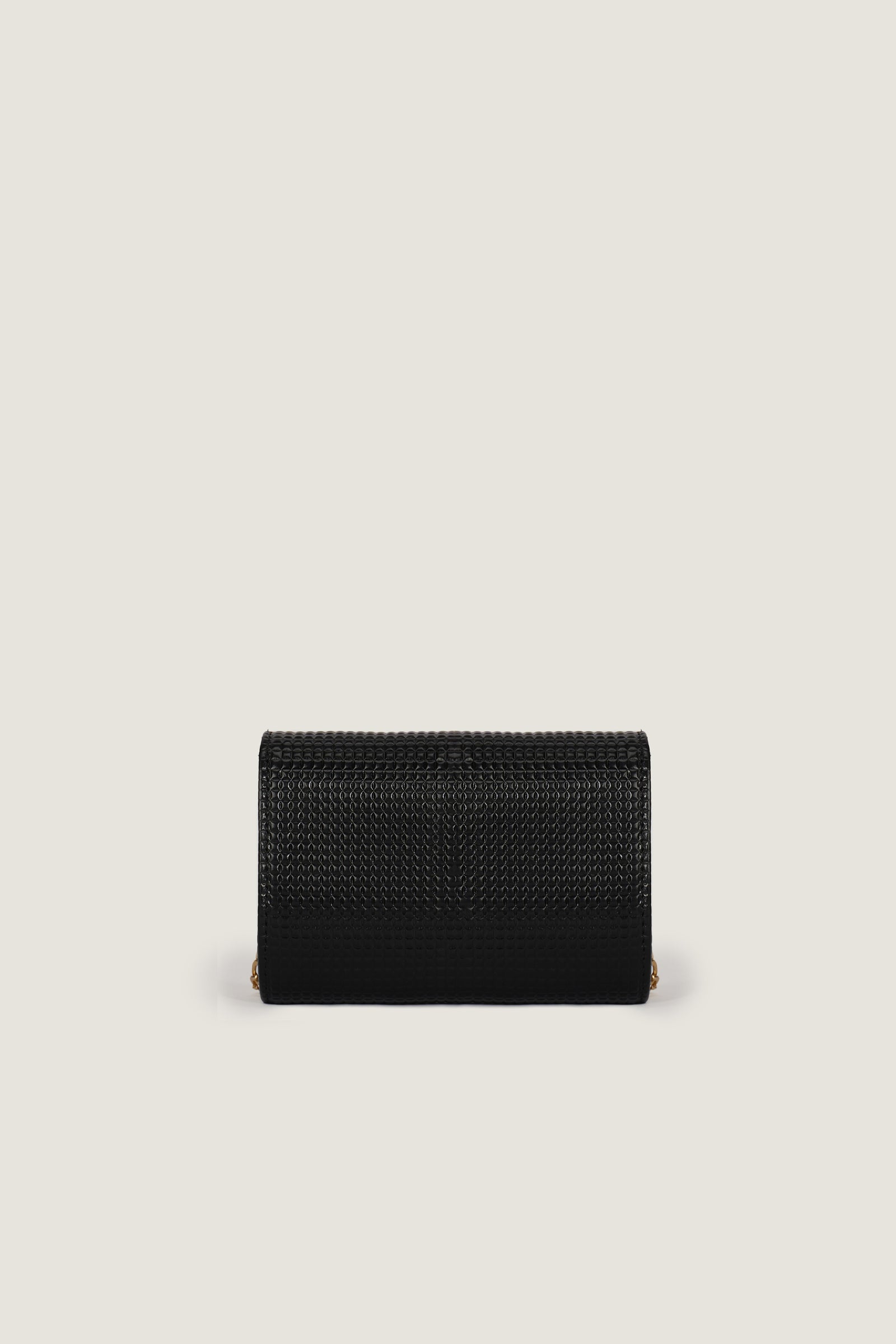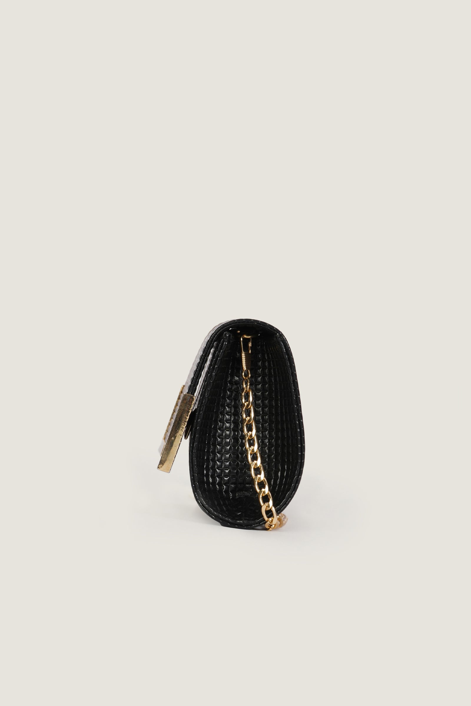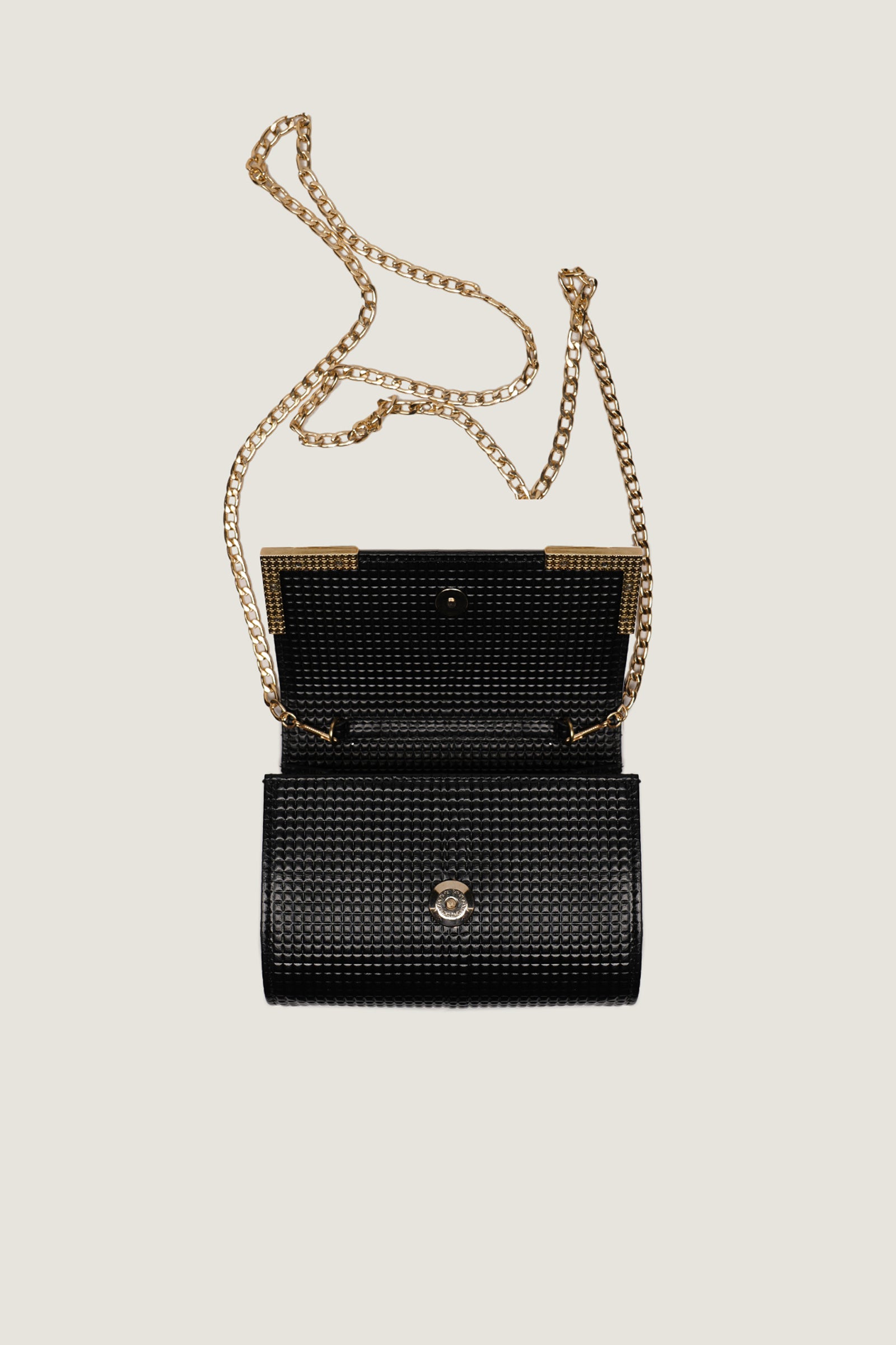 The Black Beaded Box Style Clutch, made from imported cow leather, features a spacious main compartment and a mini inside pocket. Secured with a magnetic button closure, it comes with a golden chain shoulder strap for a touch of elegance.