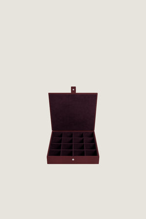 | Premium jewelry box made from smooth or pebbled cowhide leather. 16 compartments lined in microfiber for safe, organized storage. |